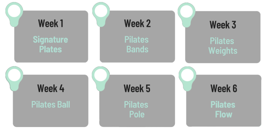 6 weeks of pilates sessions with three classes per week. Take part live or view at any time within our video library.